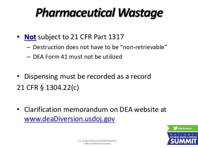 21 cfr 1304.22(c). 1 While there is no such provision this appears to be a mistaken citation to 21 CFR 130422c which sets forth the records required to be maintained by dispensers. A controlled substance that has been ordered and dispensed to a patient but not fully administered is considered wastage not inventory and should be disposed of per 21 CFR 130422c as well as all applicable federal state tribal and local laws and regulations. The number of units of finished forms andor.